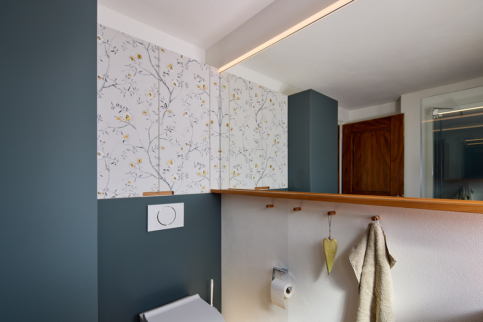 Die Material- und Farbtöne der benachbarten Küche werden aufgenommen und durch eine Tapete mit floralem Muster ergänzt. Lichtbänder sorgen für eine angenehme, indirekte Beleuchtung – eines über dem Spiegel und ein zweites in der Dusche.